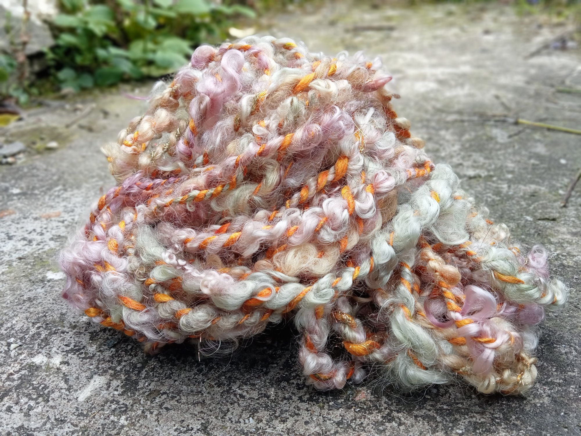 Handspun sari silk with hand-dyed longwool curls with sparkle
