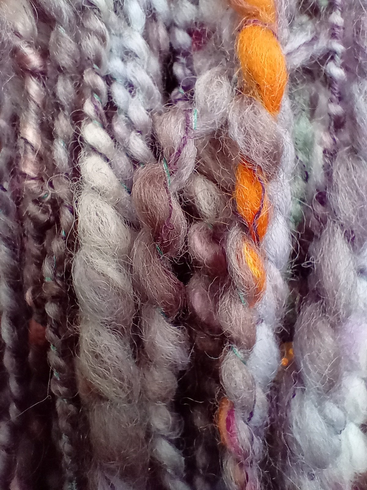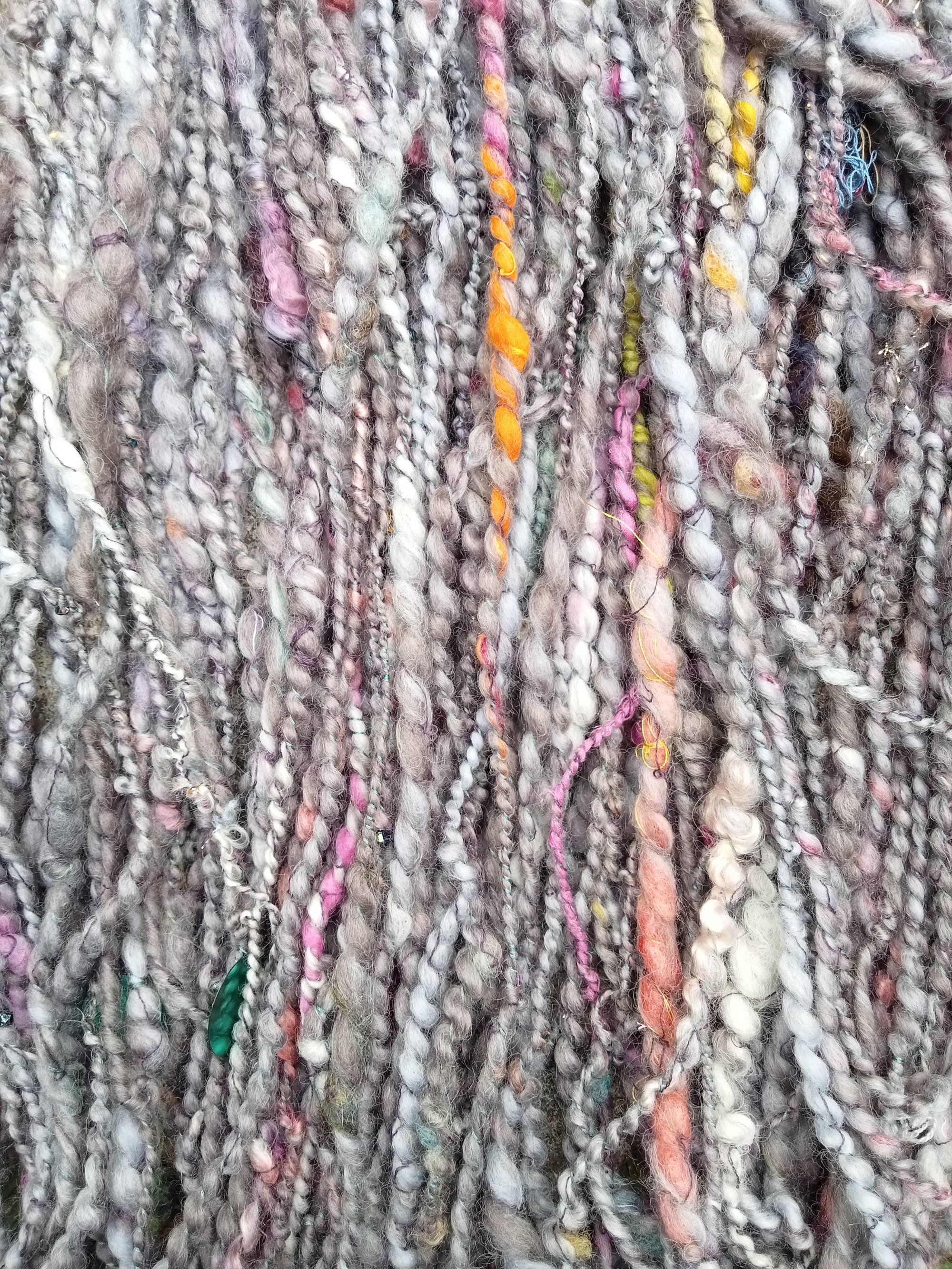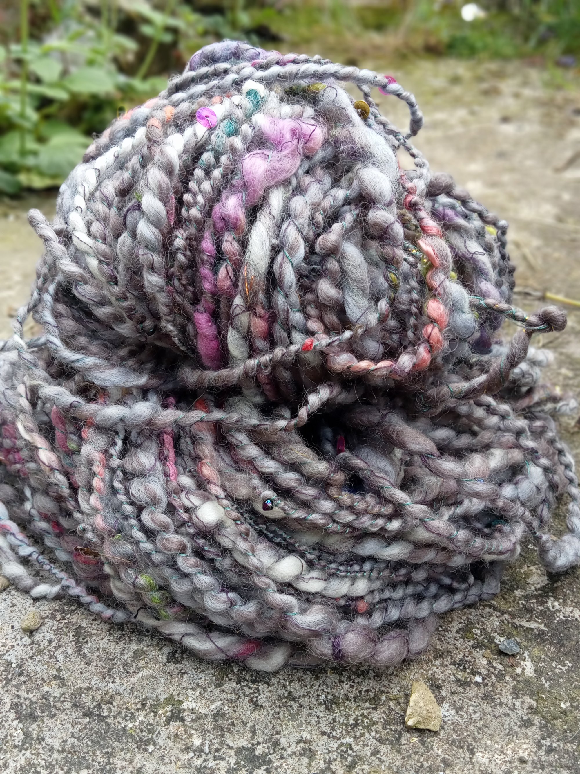 Handspun merino/corriedale, mixed yarns and faceted beads plyed with sequins